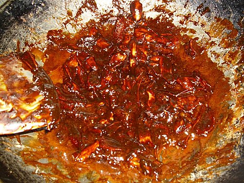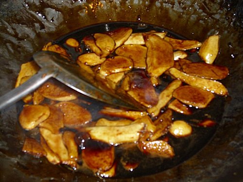 將切好的薄片放入空的炒菜鍋內炒5分鐘之後加入黑糖再用小火炒二小時